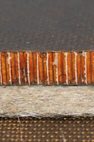 The composite was optimized to reduce the weight of these combustible organic materials (flax and bioresin) so that the total composite can meet the mechanical performance requirements while excelling in the stringent fire, smoke, toxicity and heat release tests required by the aeronautical industry. At 15 kW.min/m2 (2-minute total) and 18 kW/m2 (peak), the heat release figures for the 5.5-mm composite FibriRock panels are well within the target values (65 and 65).